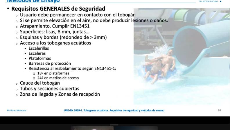La sesión se basó en la Norma UNE - EN 1069-1:2017+A1, relativa a los Requisitos de Seguridad y Métodos de Ensayo para toboganes acuáticos, que en diferentes lugares de España ya se exige cumplir, y que se exigirá en muchos otros lugares en el futuro próximo.
